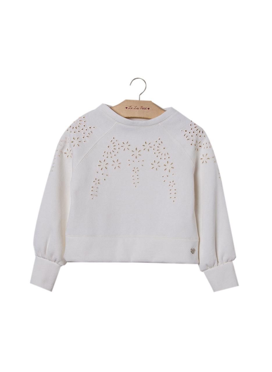 Moletom feminino infantil com modelagem solta, gola careca, bordados e manga longa raglã com punho.